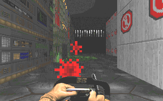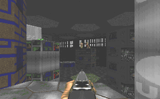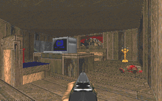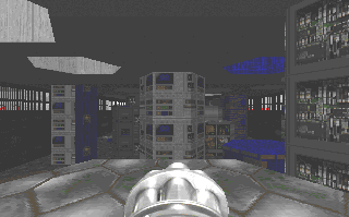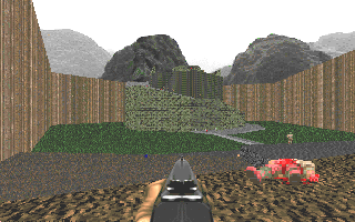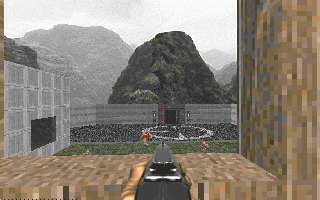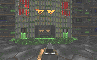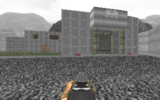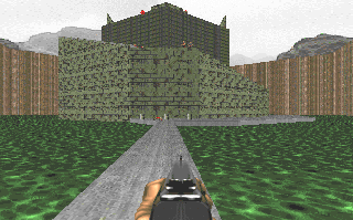 Here's something new: a level set in a military installation. 8-) You'll enter through a cave at the back, where a former fortress is marooned in a lake of rising nukage. Fight your way through a massive machine room, across to headquarters, and out into the front parking lot. Back to front.