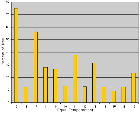 The graph and table below show what percentage of the horagrams approximate each equal temperament from 5 through 17. For example, 75% of all the horagrams of the scale tree approximate 5 t-ET. That is to say, 75% of them include a Ring 5. While any given "approximation" may be quite far off in terms of interval size, the step pattern will be the same.
