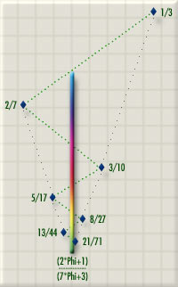 The line is divided into two sections at B, "phi way" (like 1/2 would yield "half way") from A to C. As the larger division is to the whole line, so the shorter division is to the longer: AC/AB=AB/BC=Phi.1 Savvy? For this reason, its original name may have been the Golden Section. AB and BC have no common factor, no matter how finely you divide them. In mathematical terms, the two sections of the line are incommensurable. As seen in its continued fraction form, it's the factor which provides maximum differentiation. It's the most irrational among irrational numbers.2 That's why you can keep dividing horagram intervals by Phi forever without having one radial line land squarely on top of another. A phi and a pi became lodgéd Hmm, OK, that was quite a stretch. But the number Phi pops up in a most surprising variety of disciplines. In mathematics, it is found to be related to such abstract constructs as the pentagon3, the logarithmic spiral4, and the Fibonacci sequence5. The dimensions and angles of the Platonic solids are related by way of it.6. The famous mathematician Johannes Kepler considered the Golden Ratio to be one of only two "great treasures" of geometry, the other being the Pythagorean Theorem.7 He believed that it "served as a fundamental tool for God in creating the universe."8 Italian Renaissance mathematician Luca Pacioli (1445-1517), who worked with Leonardo da Vinci, went so far as to call Phi the Divine Proportion, and wrote a book by that name about its properties and uses.9 Noble ratios are said to be found in many natural phenomena, such as the relative angles of stems to each other on many plants where it allows each stem maximum exposure to sunlight and rain, and the arrangement of seeds in florets such as the sunflower's, where it allows the seeds to fill space with maximum efficiency10. It's easy to see how that would be useful for plants, but does it really provide a musically useful ratio for scale step sizes? That question can only be answered by trying out such scales and comparing them with other kinds. I think I'm finding that Multiplying like rabbits As you look at various Golden horagrams, you'll notice that each The ROC is never mature, the rings outside the ROC are always mature (and always Golden). There are often one or more mature rings inside the ROC - such as ring 5 in the horagram above ["Ring numbers"]. Whether maturity is significant to tuning or music is currently very much uncertain. It's just something I noticed and don't want to overlook, in case it does turn out to be meaningful. Let's all do the Hop Another good reason to call them rabbit sequences is because of the sort of hop-scotch pattern they produce in diagrams. In the Golden horagrams of the Scale Tree, these patterns relate directly to the formula given by Wilson, as explained below. This is due to the fact that Phi is a continued fraction. When you "hop" out to the next ring, the next portion of the continued fraction is dropped. When you've hopped past a sufficient number of rings to drop all the pieces except Phi, the horagram converges to Gold. Magic. Golden horagrams don't grow on trees, you know. Oh, wait. Yes they do. The Noble generators used in the Golden horagrams grow from the branches Wilson's Scale Tree. (Wilson's "tree" looks more like, um, Spanish moss to me, no disrespect intended. I've made a graphic of it that looks more tree-like, which makes it easier for me to follow. David's Tree-like graphic of Wilson's scale tree) Looking at the tree, which can also be found on the first page of Wilson's Golden Horagrams PDF document, you can see that each point on the tree is an intersection of two fractions,